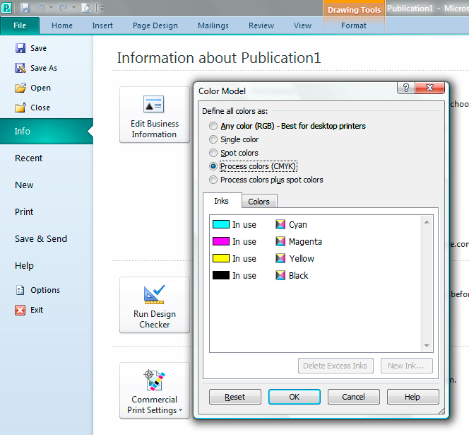 We recommend setting up Publisher for CMYK printing. To do this in Publisher 2010, click on 'File' and 'Info' should be highlighted, then click on 'Commercial Print Settings', from the menu that appears select 'Choose Color Model'. In the popup window that appears click 'Process Colors (CMYK)' and click 'OK'. In earlier versions click on 'Tools', go down to 'Commercial Printing Tools' and from the flyout menu select 'Color Printing', in the popup window that appears click 'Process Colors (CMYK)' and click 'OK'.