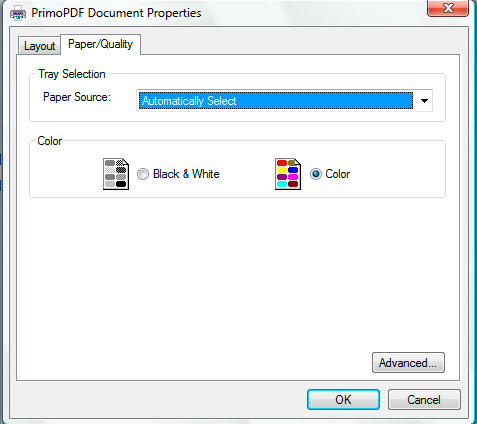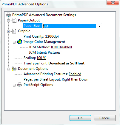 If you are using PrimoPDF then select 'File', 'Print'. Under the 'Printer' heading select 'PrimoPDF' from the drop down menu. Under the 'Settings' heading click the down arrow to the right of 'Print All Pages' and select which ever option is appropriate to you publication. Next under the heading 'Pages' select 'One page per sheet' from the drop down menu, then under the 'Printer' heading, click on 'Printer Properties', in the popup that appears select the 'Layout' tab and choose the Orientation of your page, then click on the 'Paper/Quality' tab and under the 'Color' option select 'Balck & White' if your publication IS NOT colour. Now click on the 'Advanced' button and do one of the following:-
