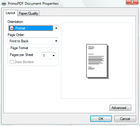 When making a PDF with PrimoPDF select File>Print from your program's menu and select the PrimoPDF printer, then select 'Printer Properties' and set the orientation of your page ur the 'Layout' tab, then select the 'Paper/Quality' tab and select Black & White or Colour (NB If your file is created in colour but you only want us to print it in Black, then choose the Black & White option). Now click on the 'Advanced' button in the bottom right hand corner and select the size of your page from the drop down menu, then select 'Print Quality' and from the drop down menu select '1200dpi' , then select 'True Type Font' and from the drop down menu select 'Download as Softfont', then click 'OK' and 'OK' again, then select 'Print', when the PrimoPDF window pops up select 'Prepress' to create the highest quality file, then click 'Create PDF', then you will be asked where you wish to save your PDF, enter a file name that easily identifies your file and click 'Save' and your PDF will be created. See further instructions below for making a PDF from Microsoft Publisher (see Guideline 4 below).