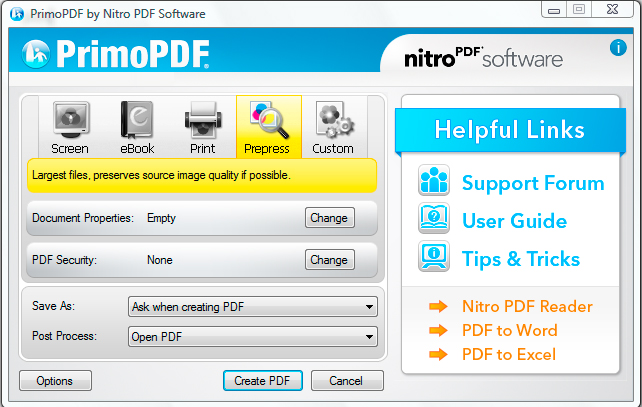 (2) When the PrimoPDF window pops up select 'Prepress' to create the highest quality file, then click 'Create PDF', then you will be asked where you wish to save your PDF, enter a file name that easily identifies your file or accept the default name and click 'Save' and your PDF will be created.