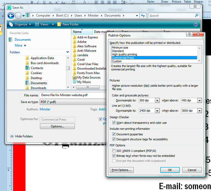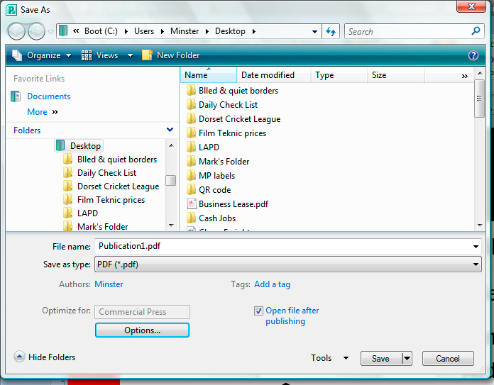 to use the 'Save As' option under 'File', then from the 'Save as type' drop down menu select PDF, then click on the 'Options' button, then in the popup box highlight 'Commercial Press', then click on the 'Print Options' button. In the popup box select 'One page per sheet', then do one of the following:-