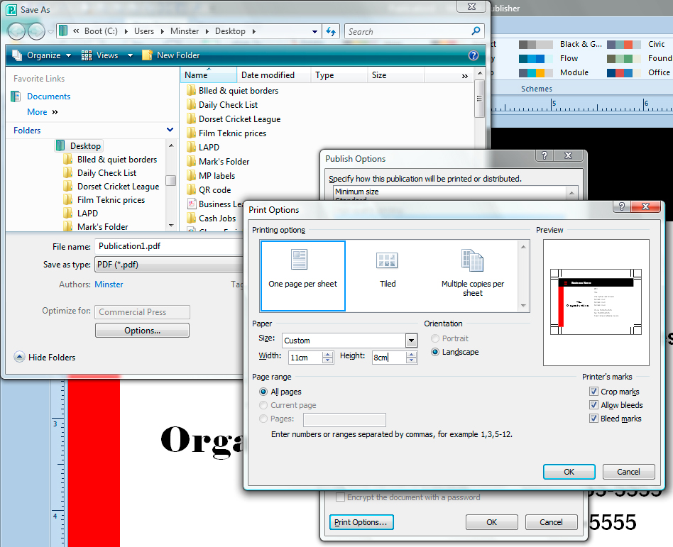 2. If your page has 'Bleed' then under 'Paper' select 'Custom Size' from the drop down menu, then increase the Width & Height of your page by 1.5cm, then under the 'Preview' box where it says 'Printer's Marks' make sure all 3 boxes are ticked,, if you click inside the 'Preview' box you should see the 'Crop & Bleed' marks. Then click 'OK', click 'OK', then click 'Save' to create your PDF.